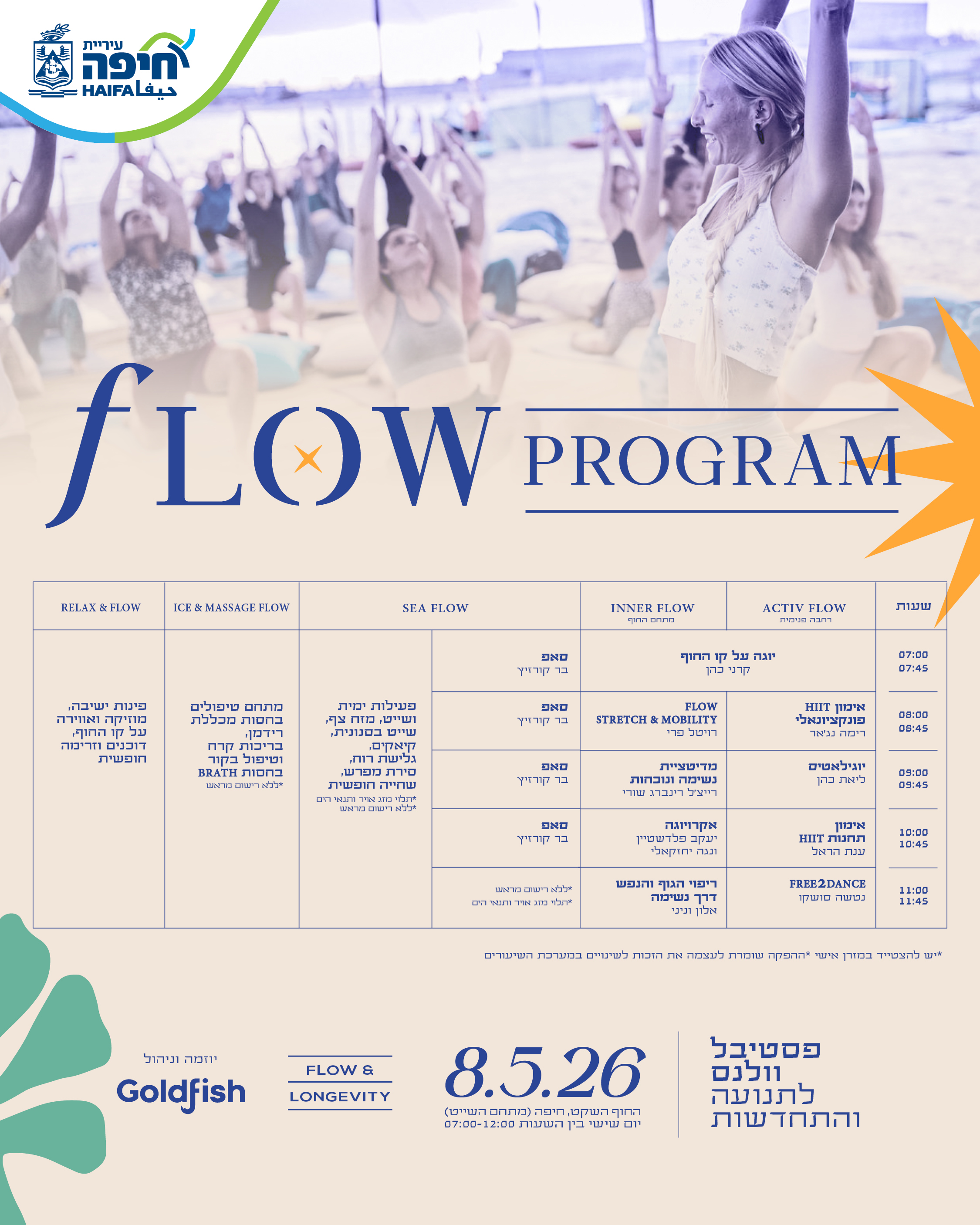 Flow by Goldfish הוא פסטיבל על קו הים, שמחבר תנועה, מים, מוזיקה ומפגש אנושי – במרחב פתוח של רעננות והתחדשות.